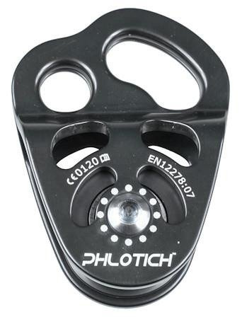 Aluminiowy, podwójny bloczek Phlotich do stosowania w systemach wspinaczkowych SRT i DRT.