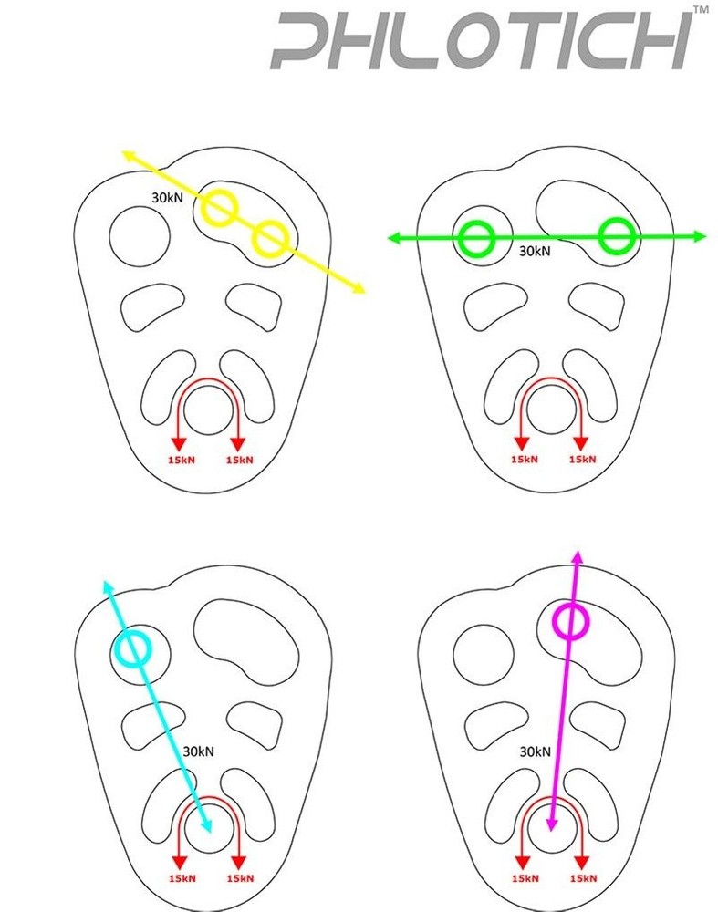 Wyposażony w ruchome okładki wykonane z wysokiej jakości aluminium oraz wydajną rolkę osadzoną na łożyskach ślizgowych. Posiada dwa otwory do wpięcia karabinka - okrągły, mniejszy oraz większy w kształcie nerki, który pozwala na wpięcie karabinków nawet o niestandardowych kształtach, ich swobodny obrót i konfigurację.