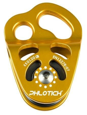 Aluminiowy, podwójny bloczek Phlotich do stosowania w systemach wspinaczkowych SRT i DRT.