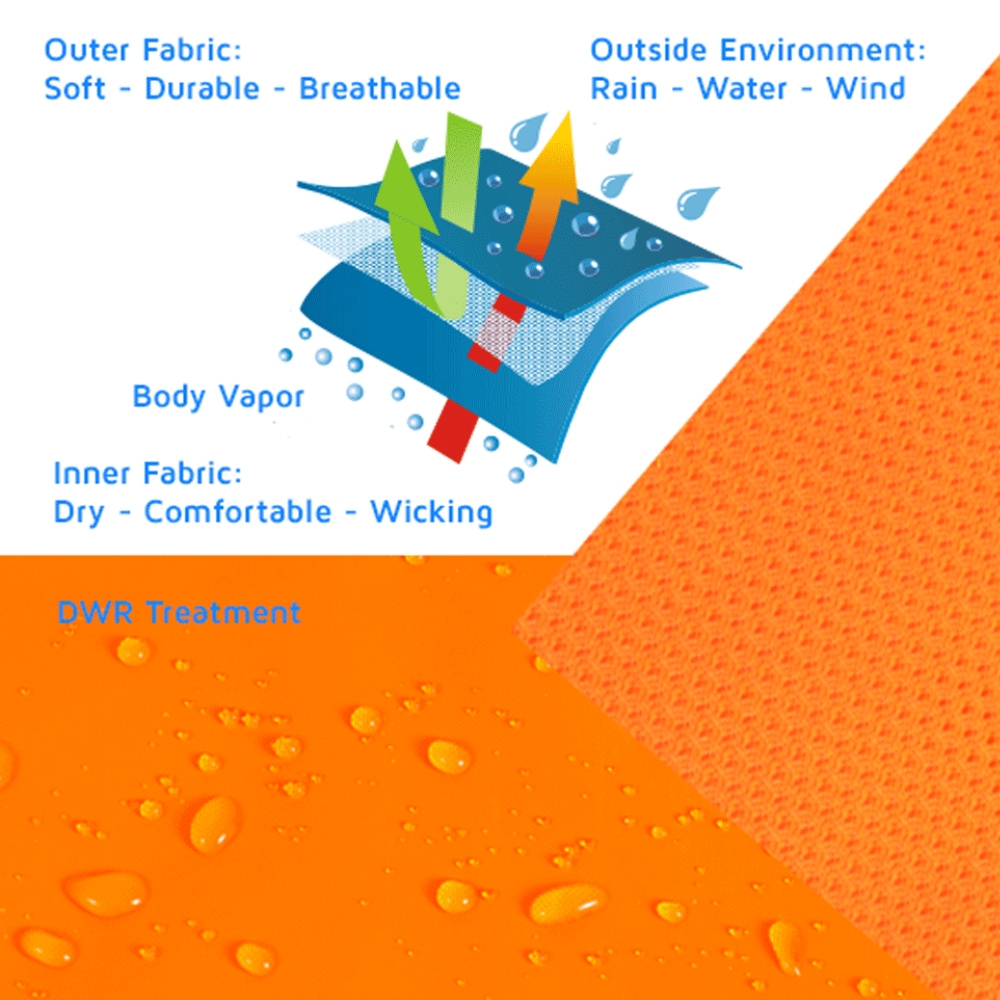 - Warstwowa, wodoodporna, oddychająca tkanina z powłoką DWR