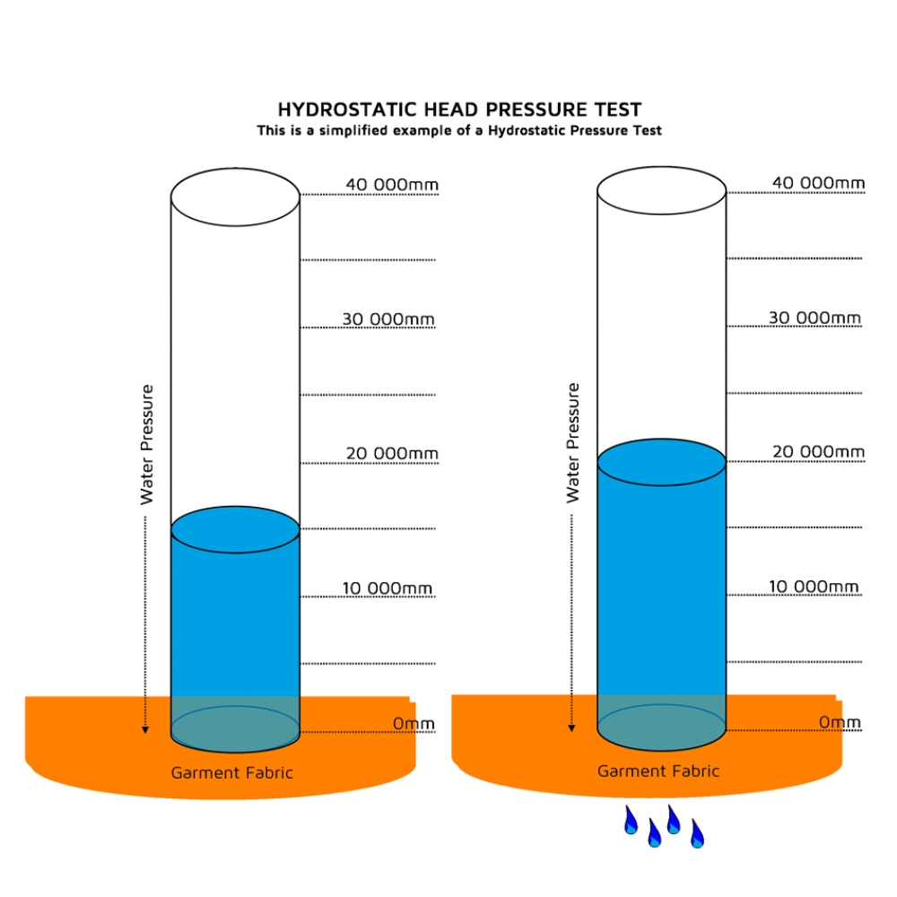 20000 mm słupa wody wywiera większe ciśnienie na tkaninę niż 10000 mm słupa wody, dlatego dokładniejszym opisem ciśnienia hydrostatycznego jest miara ciśnienia wody odpowiadająca 2,0 m słupa wody.