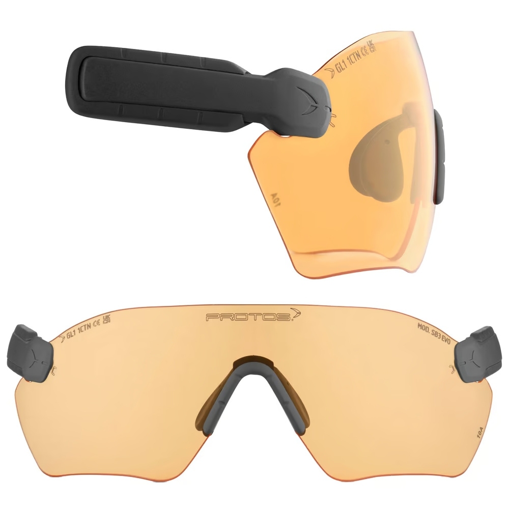 Nowo zaprojektowany, ergonomiczny mostek nosowy gwarantuje bezpieczne i wygodne dopasowanie – nawet podczas długich zmian i w ciągle zmieniających się warunkach. Podobnie jak w poprzednim modelu, okulary ochronne PROTOS® SB 1–4 EVO mocuje się zatrzaskowo na opasce kasku, a gdy nie są używane, wygodnie wsuwają się do środka kasku.